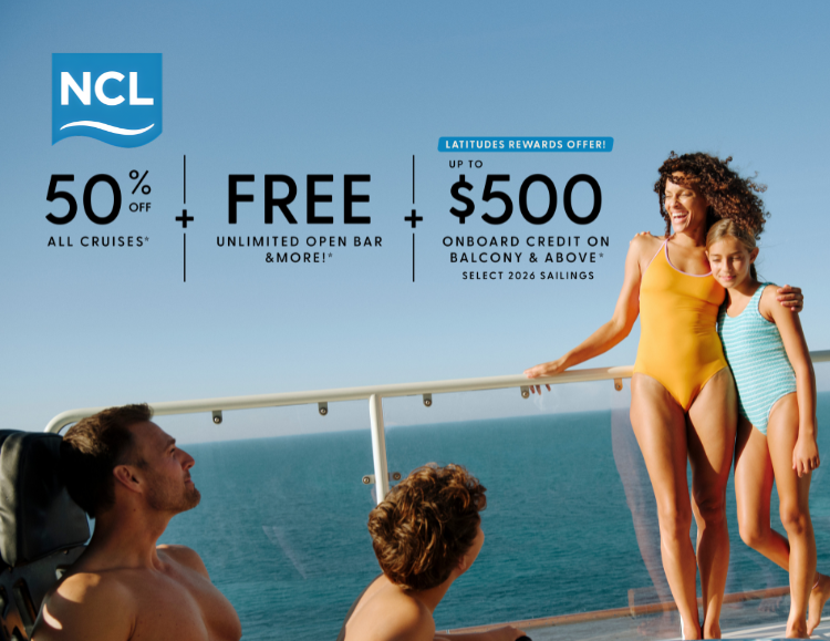 Take advantage of this exclusive Latitudes Rewards member offer and enjoy 50% off all NCL cruises (promo code DISC50)—making it easier than ever to plan the vacation you’ve been waiting for. On top of the savings, you’ll also receive Free at Sea™, which includes unlimited open bar and specialty dining, so your cruise already feels more elevated from the moment you book. For select 2026 sailings, you can also enjoy up to $500 onboard credit per stateroom, with the highest value available on balcony staterooms and above. It’s extra spending money to use onboard for spa treatments, excursions, dining, and more. This is a limited-time offer available April 14–April 20 on select 2026 sailings. Promo code DISC50 is required, and onboard credit varies by sailing and stateroom category. Capacity is limited and restrictions apply.